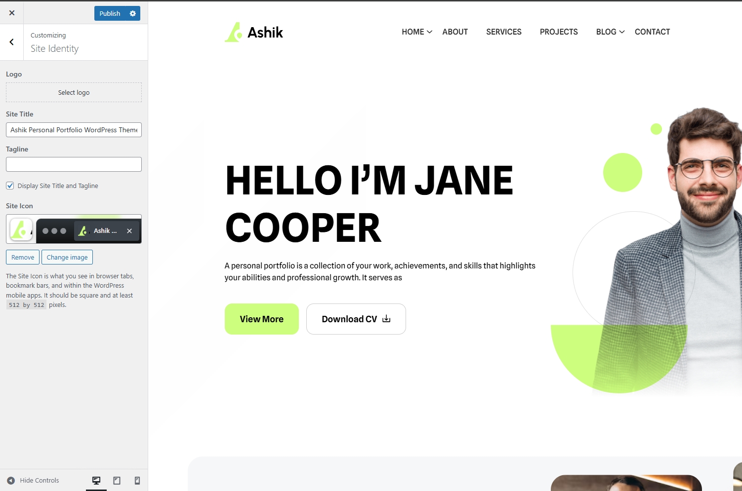 To change your Site title and Favicon login to wp-admin and navigate to Dashboard > Appearance > Customize > Site Identity and follow the following steps: